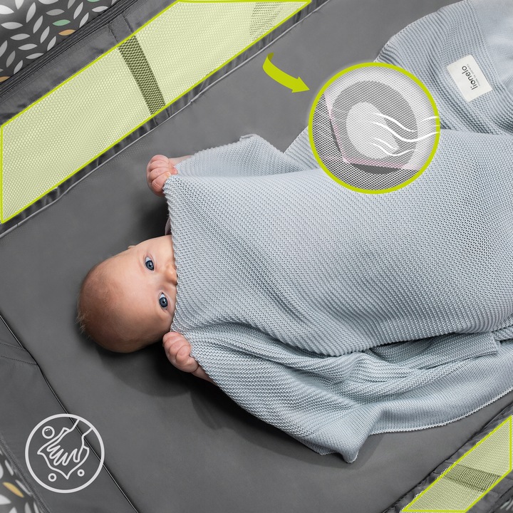 ✔ Przewiewna siatka na dłuższych bokach zapewnia odpowiednią cyrkulację powietrza i podgląd na pociechę.